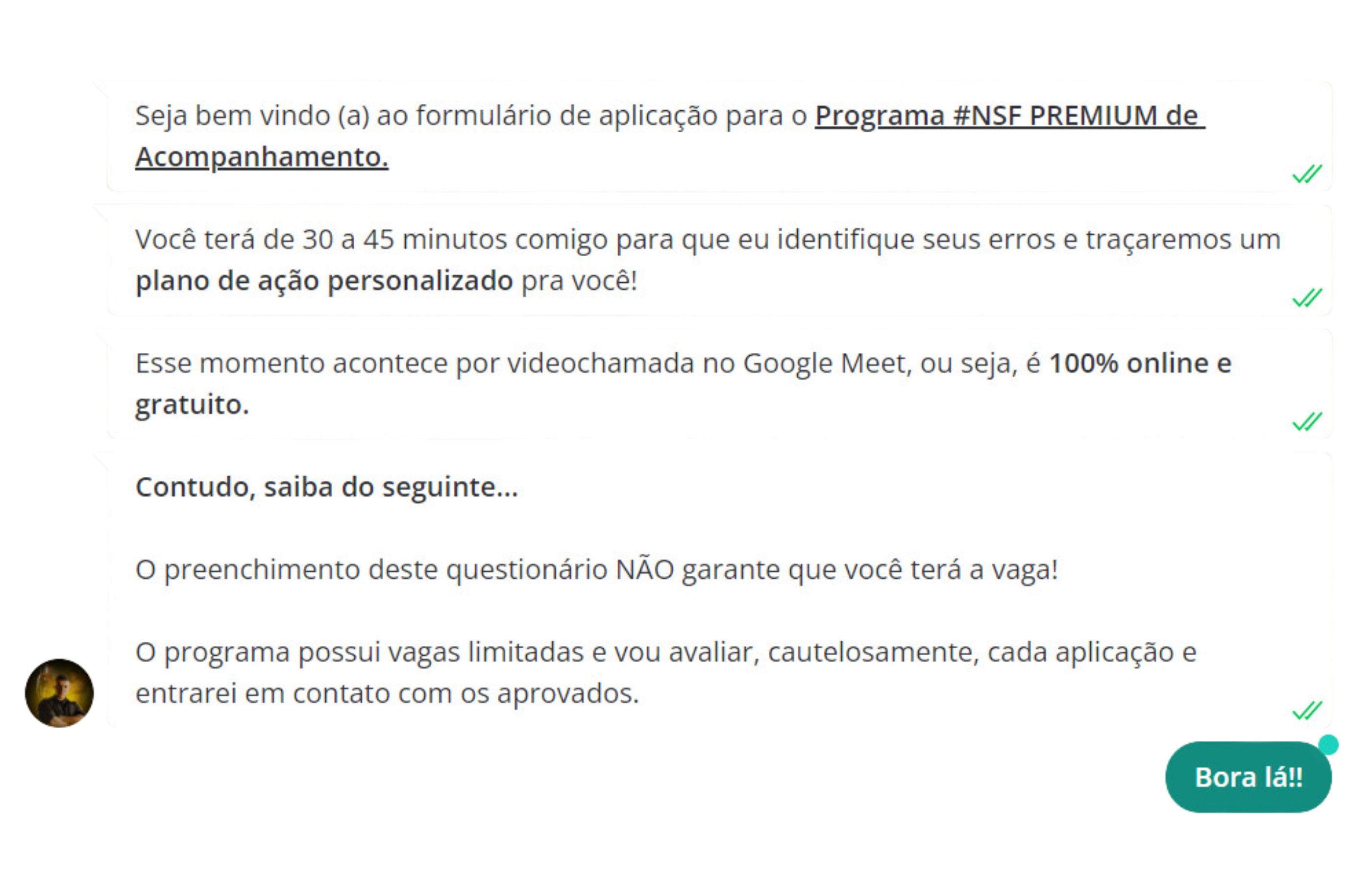 Quinzenalmente irei te enviar uma pesquisa dinâmica, que eu chamo de “check-in”, e nela irei coletar as informações necessárias para avaliar seu progresso, tais como fotos, peso, etc